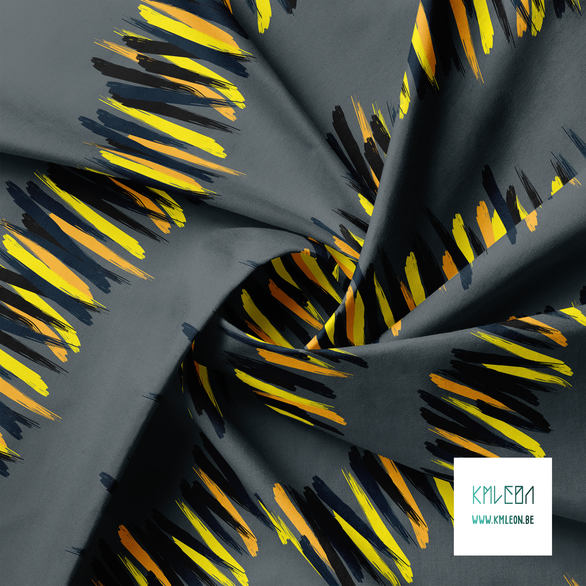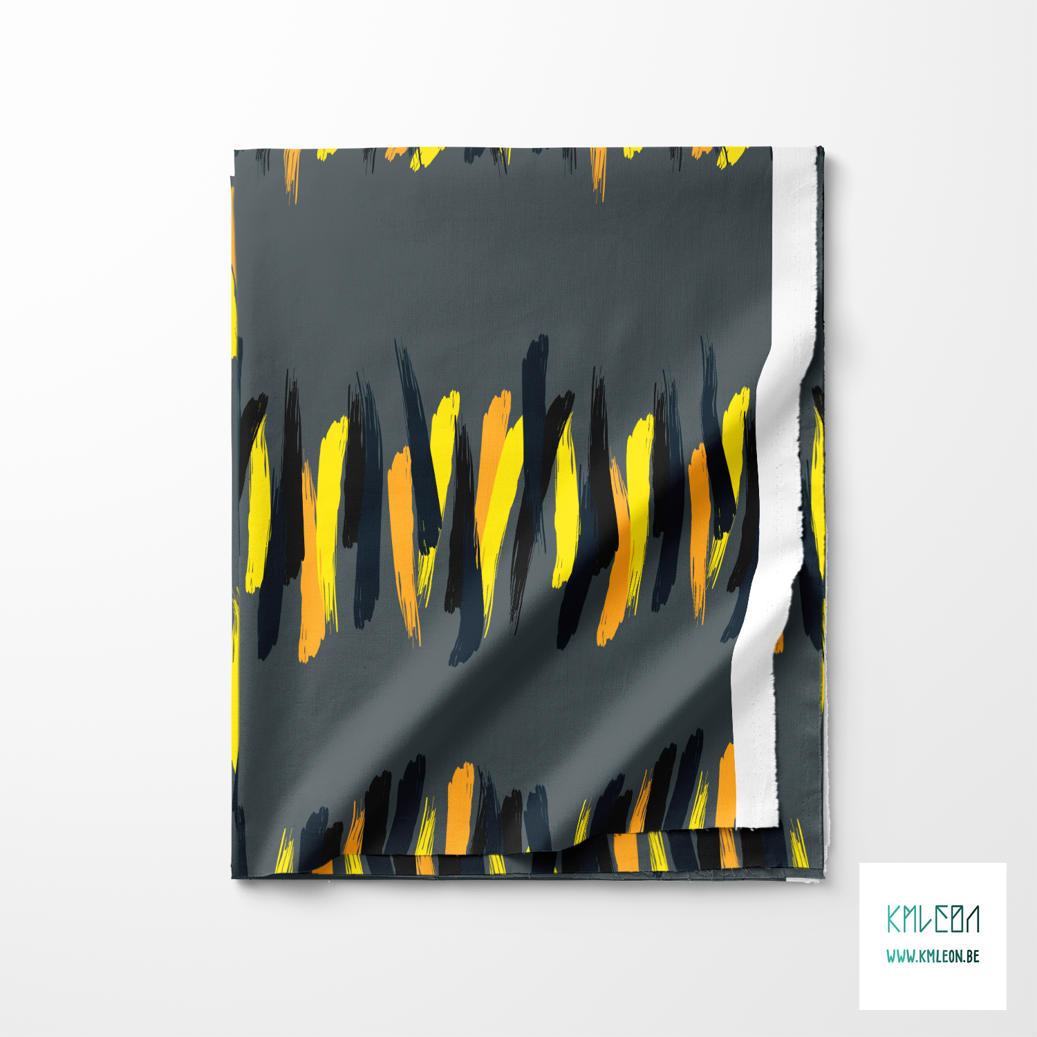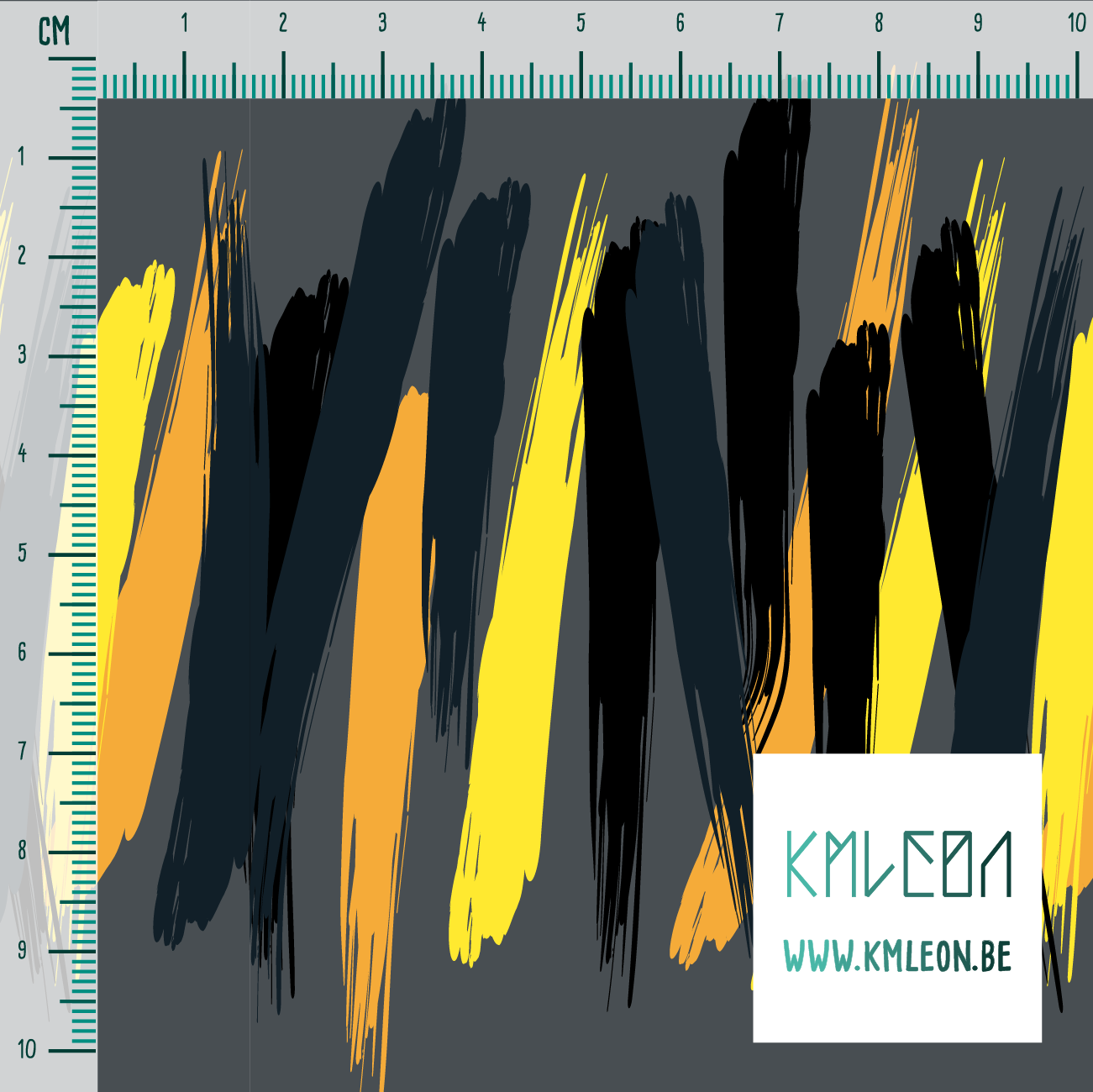 Orange, yellow, black and dark teal brush strokes, against a grey background.