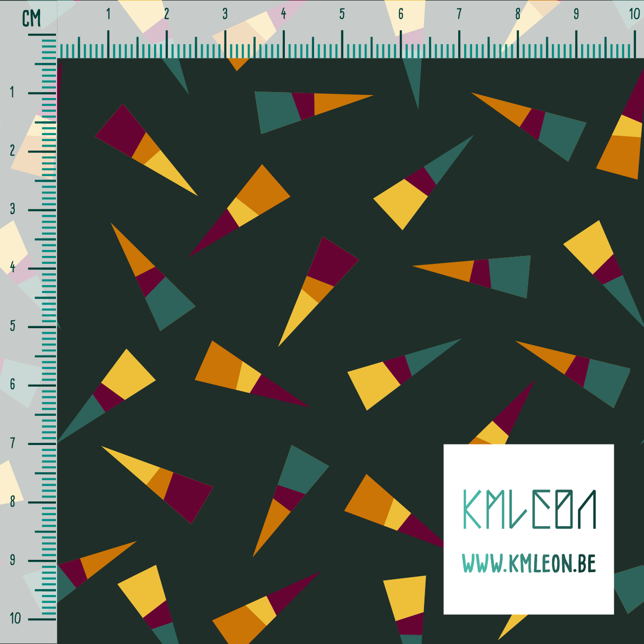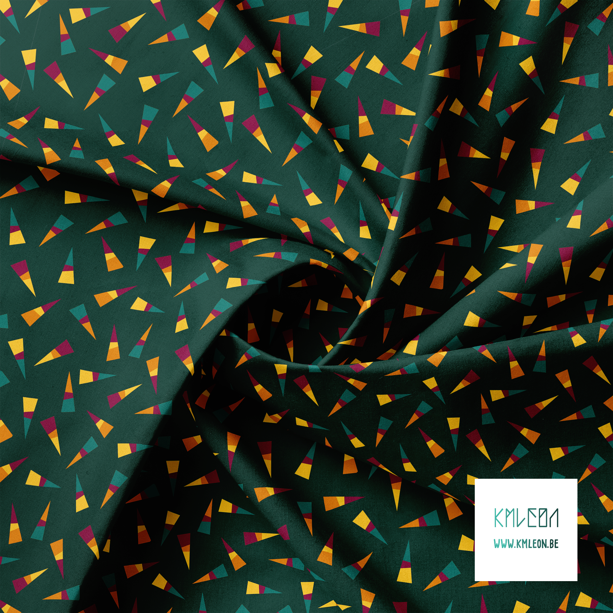 Yellow, orange, green and purple triangles, against a green background.