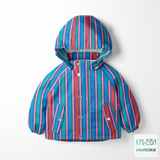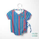 Blue, pink, teal and red vertical stripes, against a blue background.
