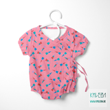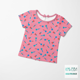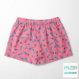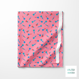 Blue, purple, teal and red triangles fabric, against a pink background.