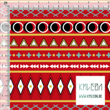 Geometric shapes in yellow, teal, black and white, against a red background.