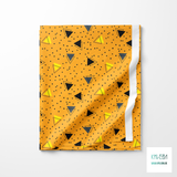 Grey, black, yellow and dark teal triangles and dark teal dots fabric