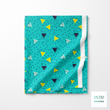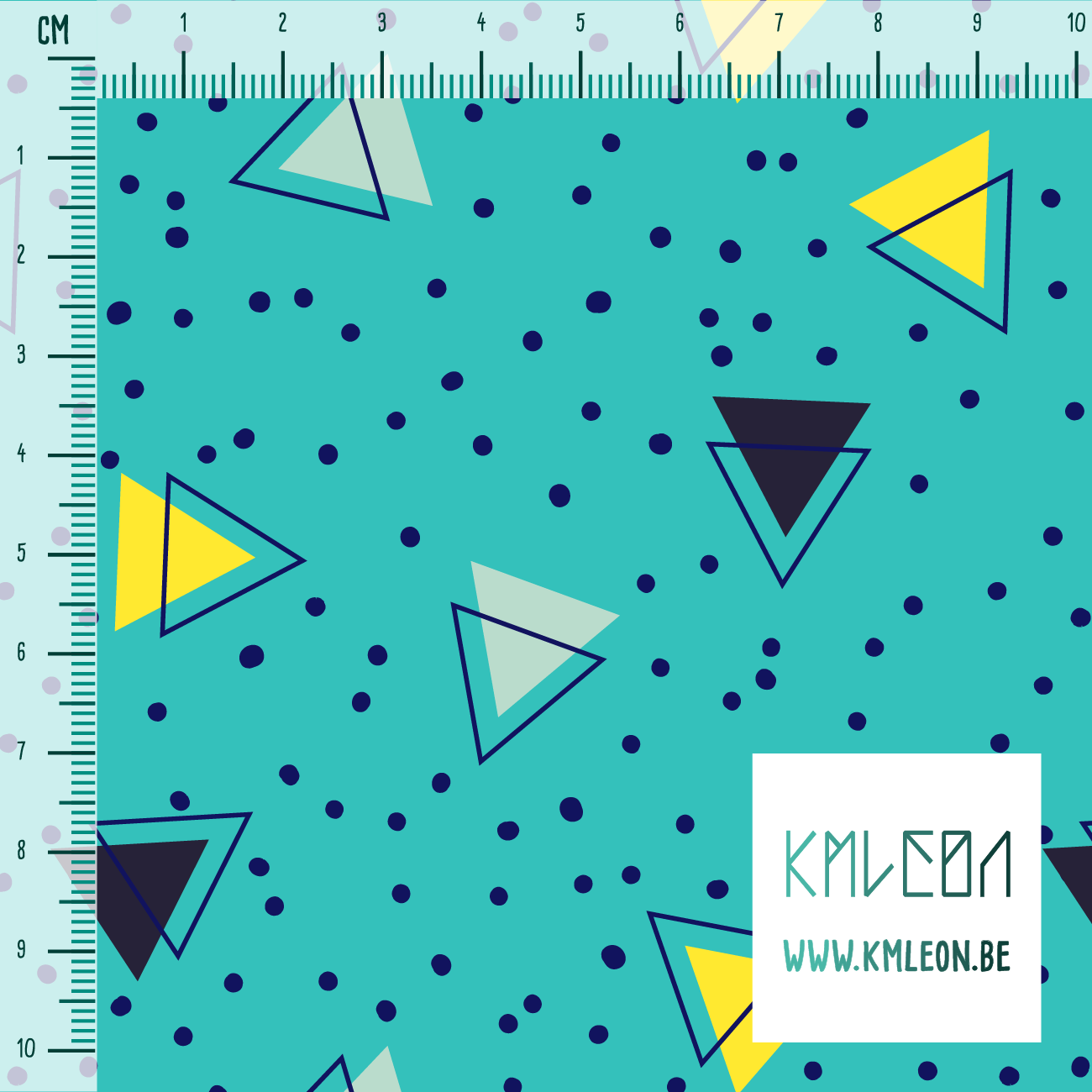 Navy, mint green and yellow triangles and blue dots, against a teal background.