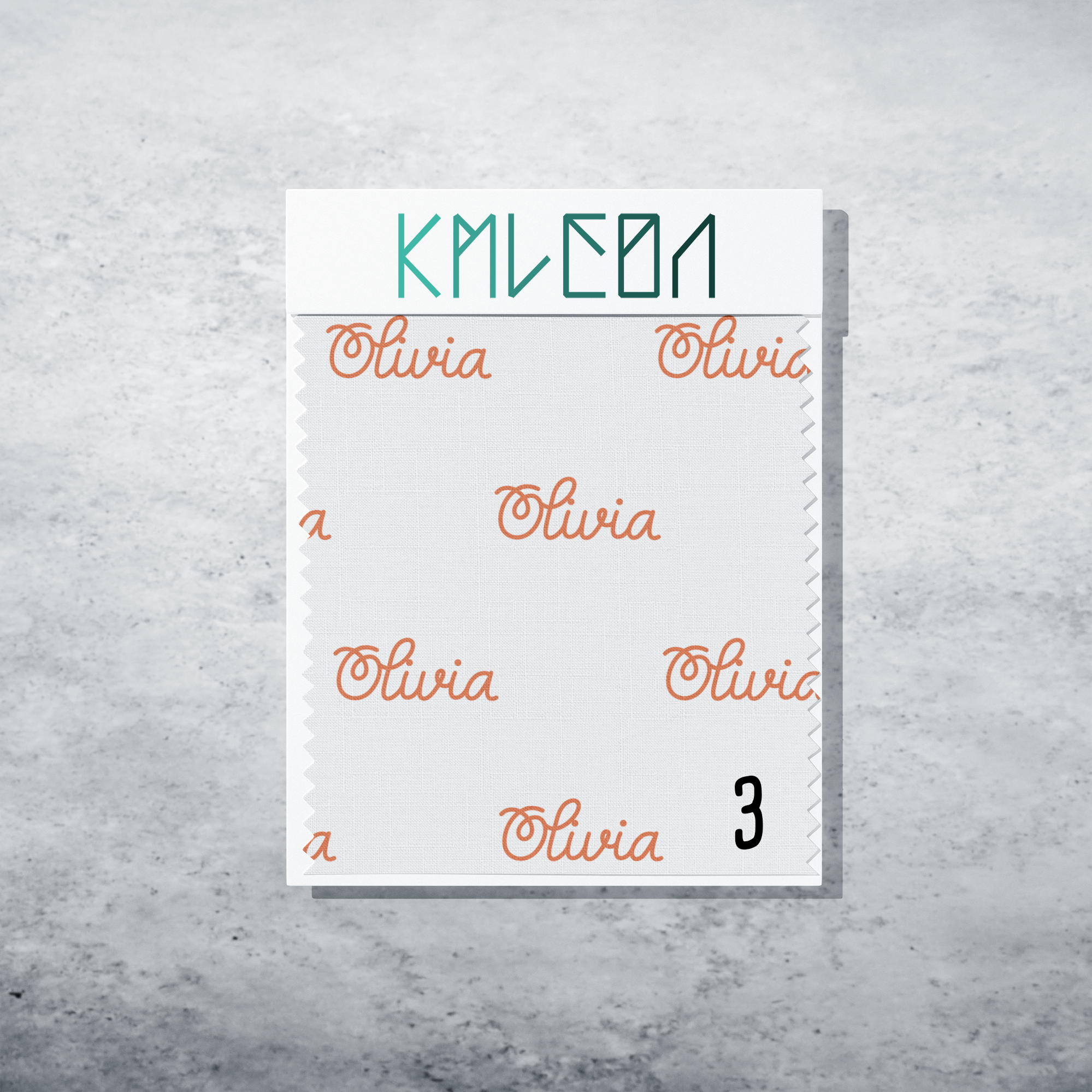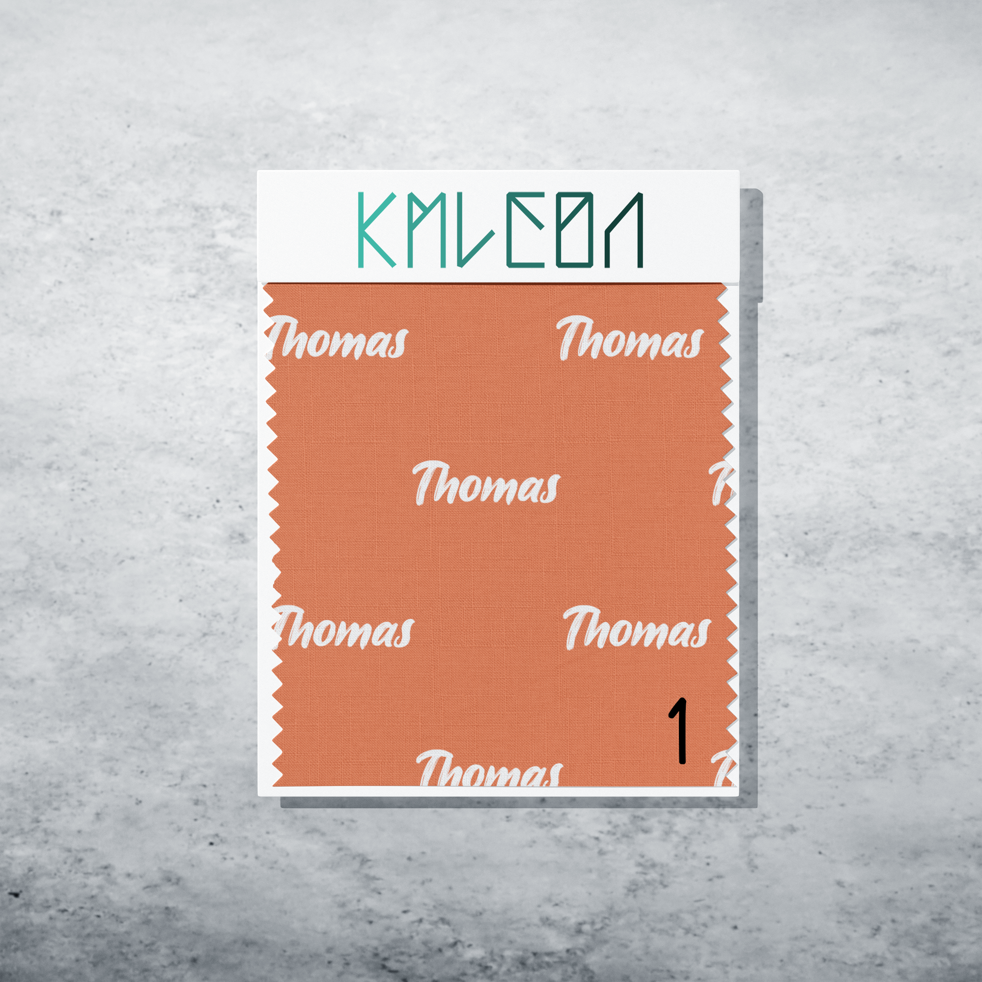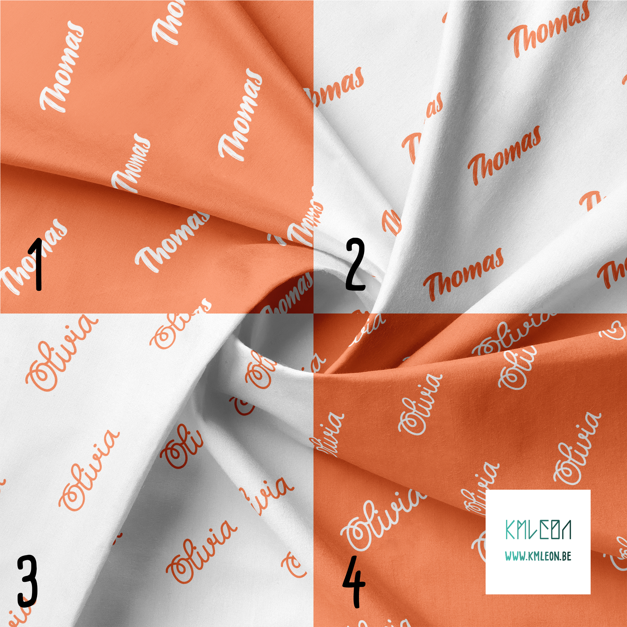 Personalised fabric in coral sunset. There are 4 different personalisation options: choose a white base (with coloured letters) or a coloured base (with white letters) and choose one of 2 available fonts.
