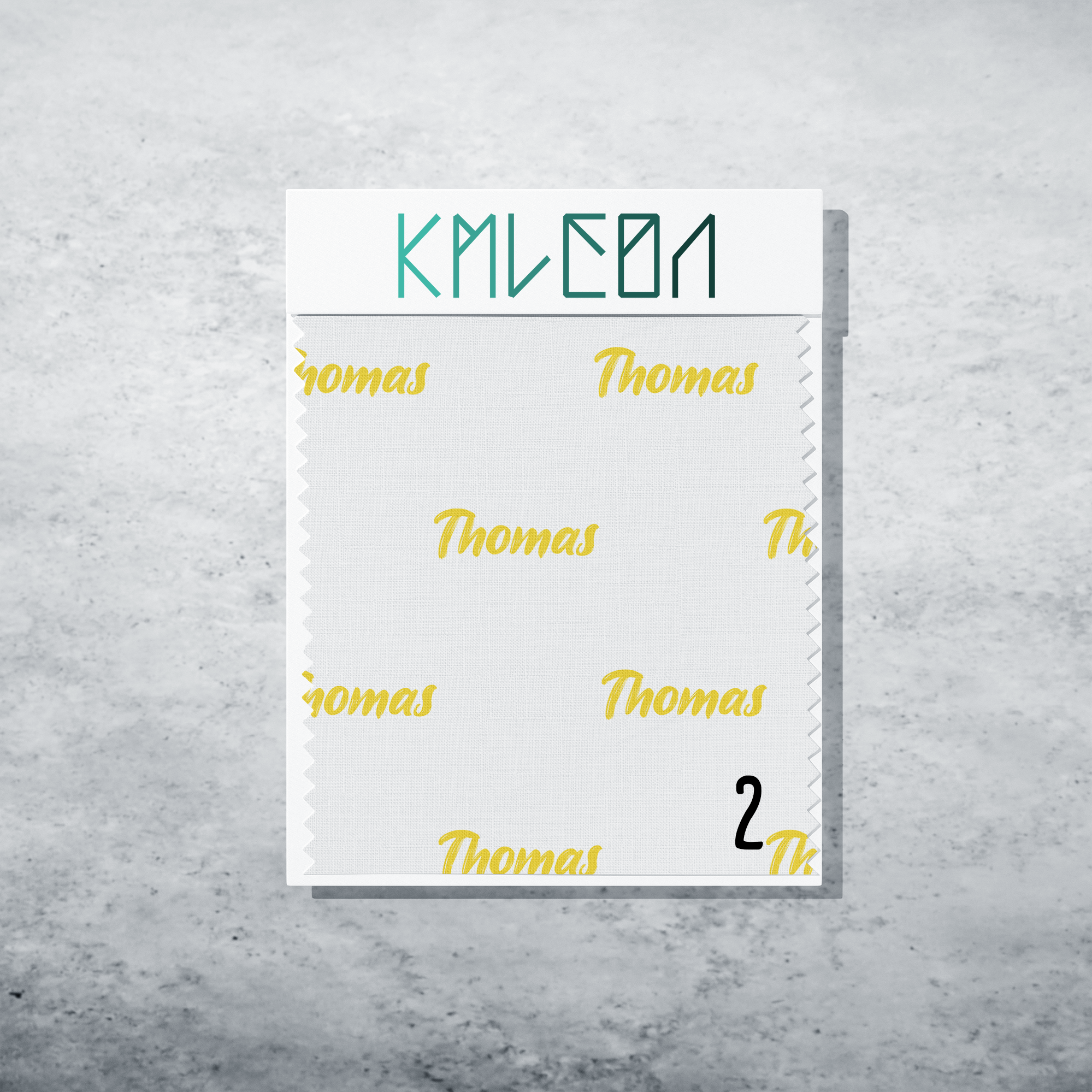 Personalised fabric in gold yellow. There are 4 different personalisation options: choose a white base (with coloured letters) or a coloured base (with white letters) and choose one of 2 available fonts.