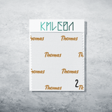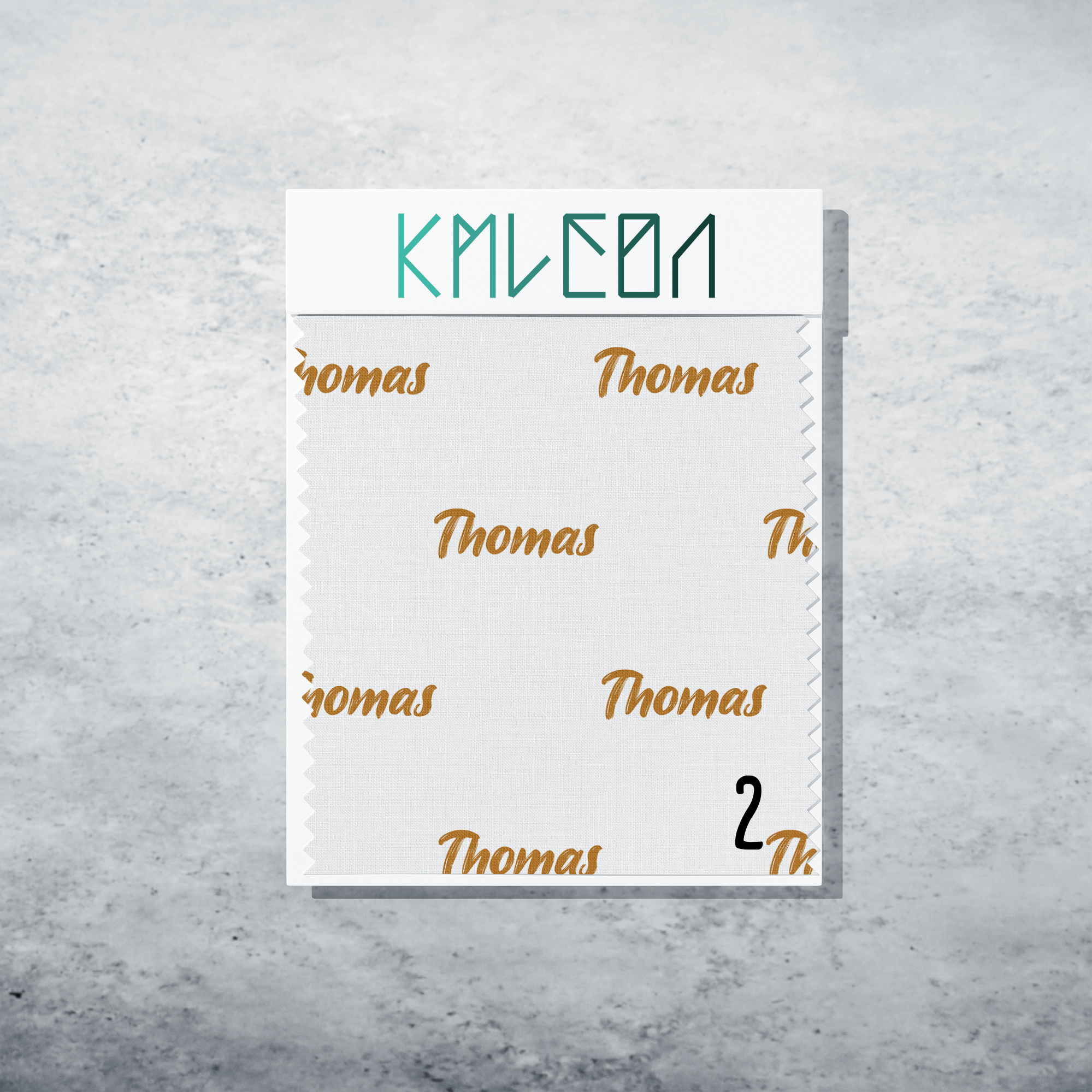 Personalised fabric in ochre. There are 4 different personalisation options: choose a white base (with coloured letters) or a coloured base (with white letters) and choose one of 2 available fonts.