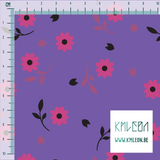 Pink and black flowers and leaves, against a purple background.