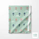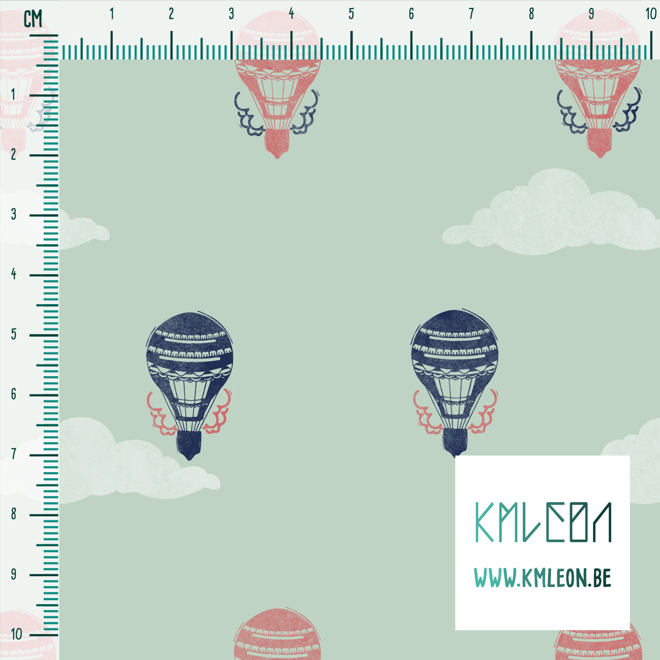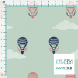 Pink and blue hot air balloons and clouds, against a mint green background.