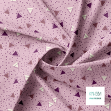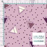 Pink, cream and purple triangles and purple dots, against a pink background.