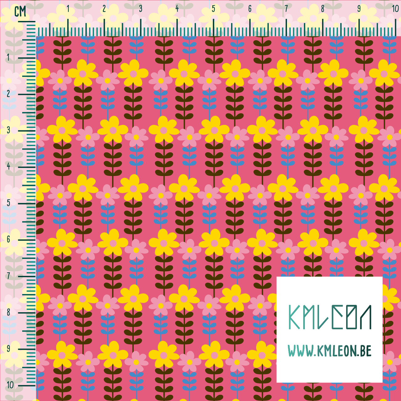 Pink, yellow, blue and brown flowers, against a pink background.