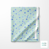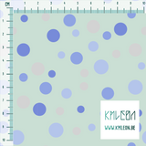 Random grey and periwinkle polka dots, against a mint green background.