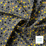 Random orange, yellow, black and dark teal polka dots, against a grey background.