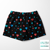 Red, teal and blue hearts, against a black background.