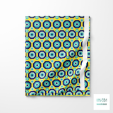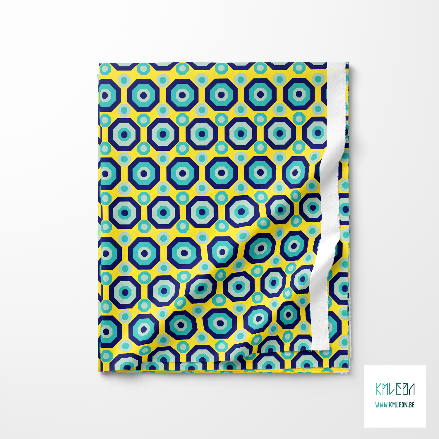 Retro octagons in navy and teal, against a yellow background.