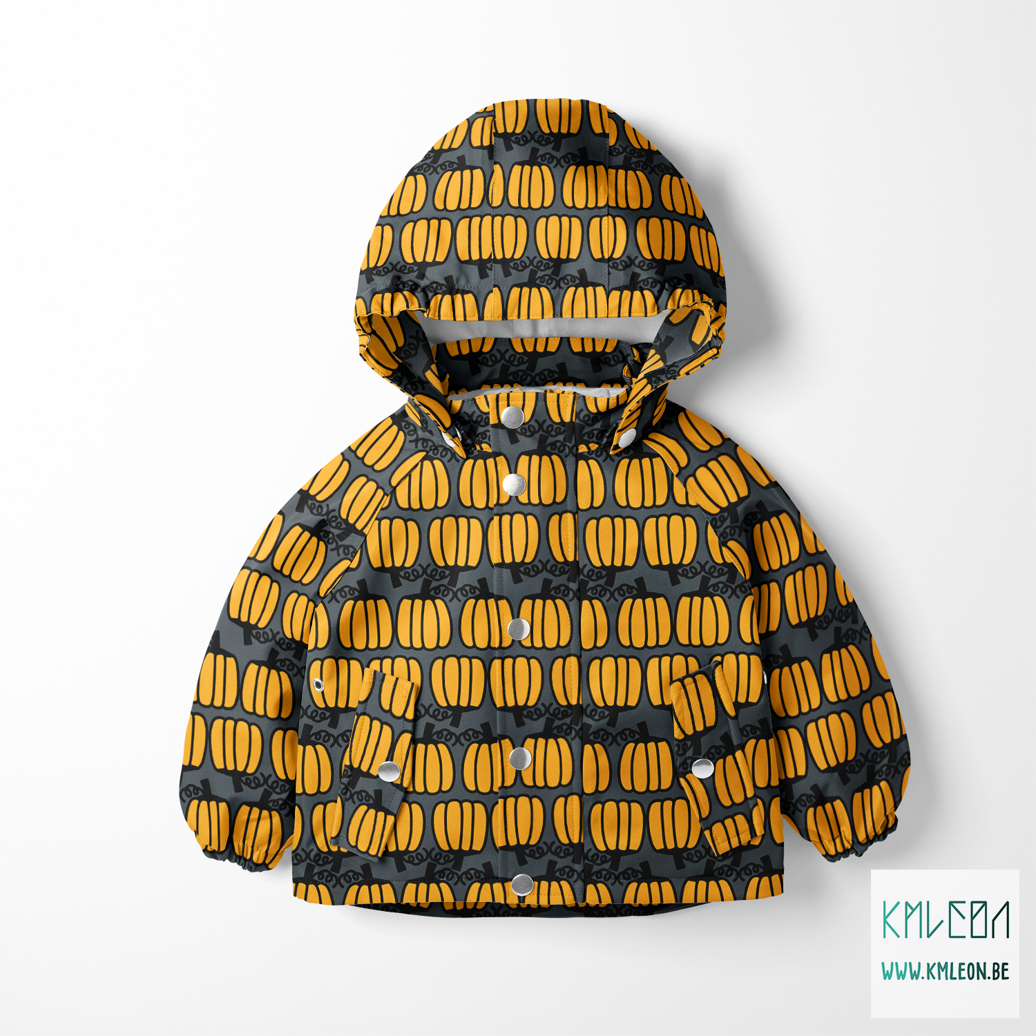 Rows of pumpkins fabric, against a grey background.