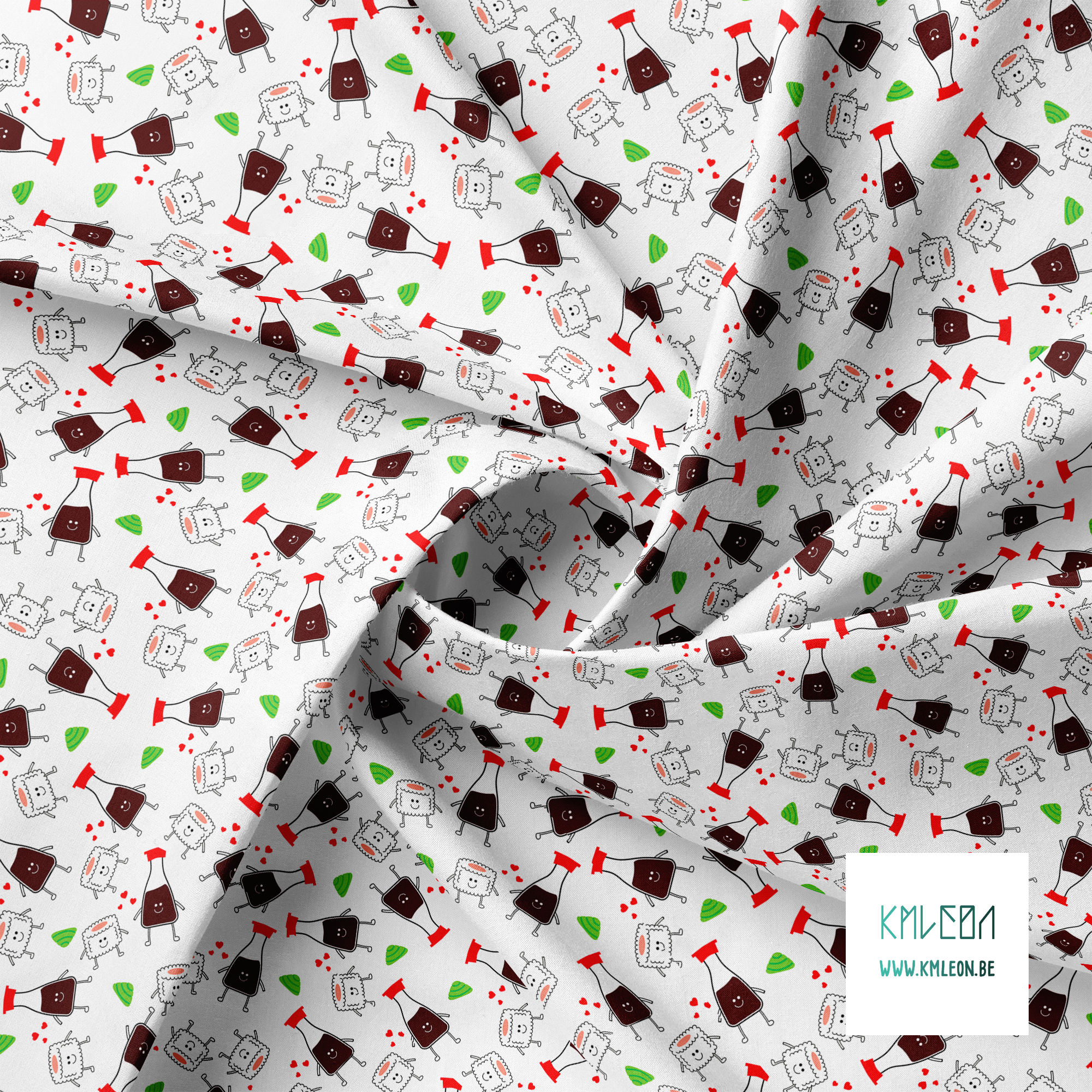 Soy mates, soy sauce, wasabi and sushi, against a white background.