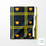 Yellow and grey plaid with orange hearts, against a dark teal background.