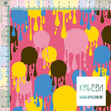 Yellow, blue, pink and brown graffiti, against a pink background.