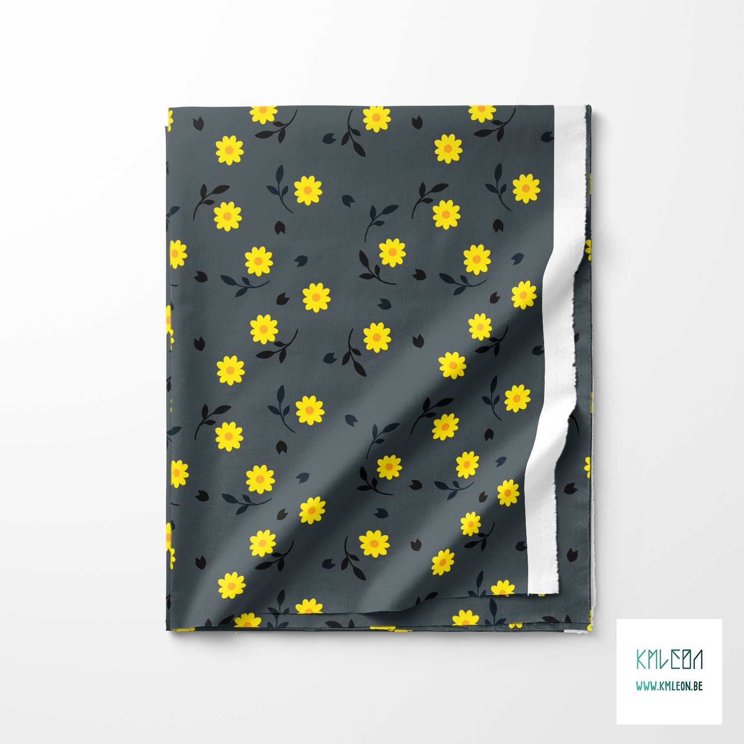 Yellow, orange, black and dark teal flowers and leaves fabric